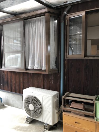 エアコンを取付けた後にカーポート屋根が出来たようです。配管を移設せずにそのまま屋根を施工されたのでこのような状態になってしまっています。さてどうやって最小限の変更でエアコンを交換するか・・・ご覧ください。