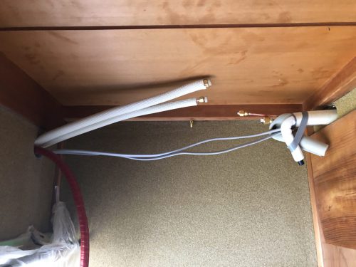 室内機を取付て縁側で配管を接続します。ドレンホースも断熱して結露による水滴が落ちないように対処しています。