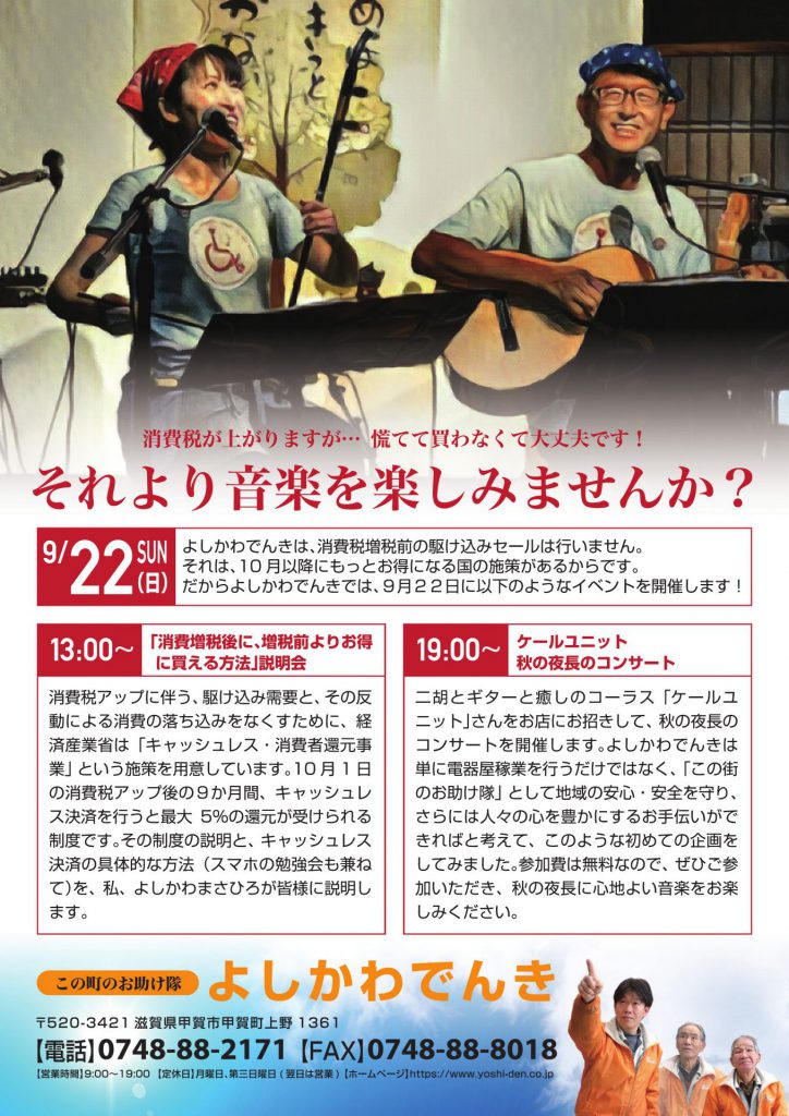 世間は増税前の駆け込みセールで騒がしい事になっていますが、よしかわでんきでは増税前セールを行いません。それは10月以降にお得になる国の施策があるからです。だからよしかわでんきでは、9月22日(日)に当店店頭で下記のようなイベントを開催させて頂きますよ~