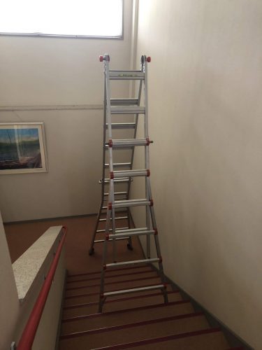 部屋の照明器具が終わると廊下やトイレとドンドン狭い場所へと作業を進めていきます。そして、最後に残ったのは高い位置にある階段の照明。こんな特殊な脚立を使って交換作業を行います。