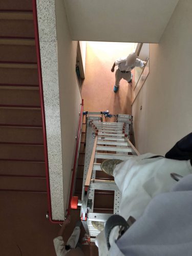 下方向の階段の上にも器具があるのですが脚立が届かなくなるので足場を組んでその上に脚立を建てて作業を行いました。