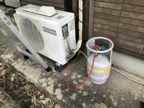 室外機が動かない状態だったのでいつものように真空にしたボンベに冷媒配管分のフロンガスを回収します。回収したフロンガスはお店に戻ってからフロンガス回収機を使って室外機に戻します。