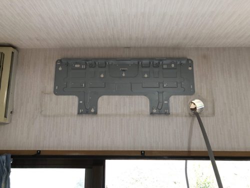 古い室内機を取りはずして新しい室内機の背板をしっかりと固定します。貫通スリーブが使われていなかったので追加させて頂きました。