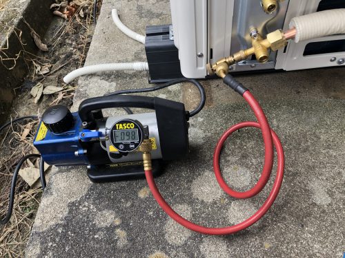 全ての配管が接続出来たら、冷媒配管内を真空にして乾燥と機密の確認を行います。