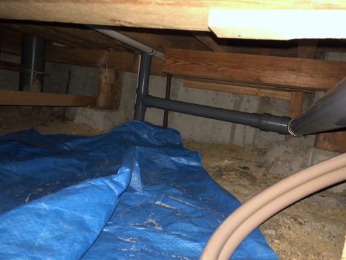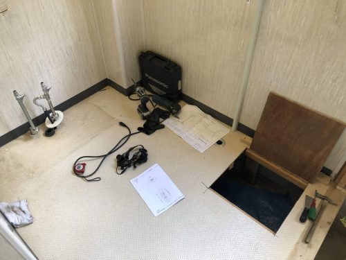 今回の浴室リフォームで脱衣室に設置されている洗面化粧台を新しくするのに伴って場所を若干左寄りに設置するために給水・給湯・排水管の位置を変える作業もさせて頂きました。とは言っても床下に入っての作業が必要な為、洗濯機が置かれていた場所を開口して床下に入れるようにしました。