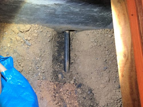 ちょうど床下点検口の真下あたり、掘り下げていくと配管が出てきました。コンクリ―トを割るよりかなり時間の短縮になりました。