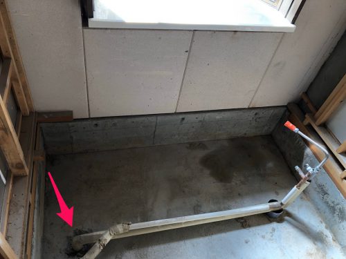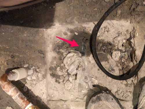 配管はベタ基礎の中に直接埋まっているのでこうなると一旦コンクリートを斫って割れた配管を繋げられる所まで掘り下げる必要があります。水道配管が直接コンクリートに埋まっているなんて今なら絶対にやらない工法ですね。10cmほど割っていくと割れた配管が横に曲げられている部分が出てきました。赤矢印の部分です。この方向は床下点検口を開けた方向だったので反対側からの補修に切り替える事にしました。