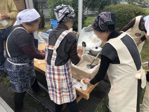 同時進行で給食給水班の方々による非常食の炊き出しが行われました。初めて防災ベンチを使って薪でお湯を沸かしました。この薪も風雨がきつい時には濡れてしまう場所に保管されていて、今後検討が必要だと話が出ました。
