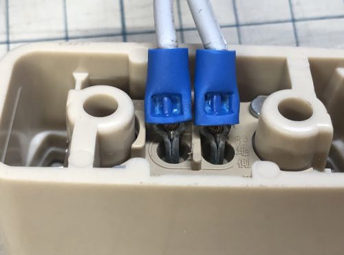 「より」線を「単線」に換える棒端子を使うとこのように器具からはみ出てしまいます。このまま引掛けシーリングを天井面に付けると干渉してしまいます。