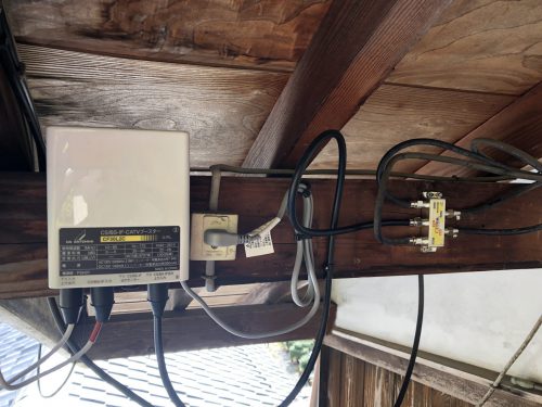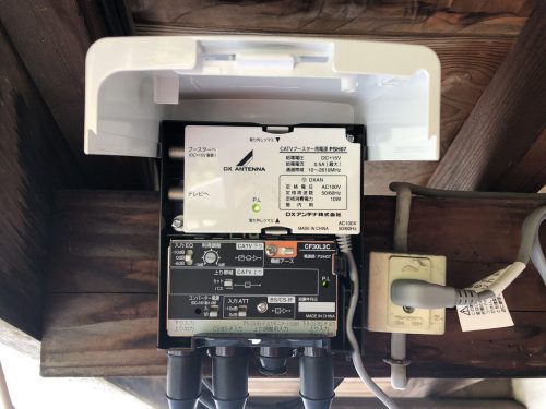 複数付いていた機器を一つにまとめられる共聴用ブースターに交換して分配器も交換しました。ここは吹き込みもなく雨風が当たる場所ではないので屋内用の分配器を取付けました。
