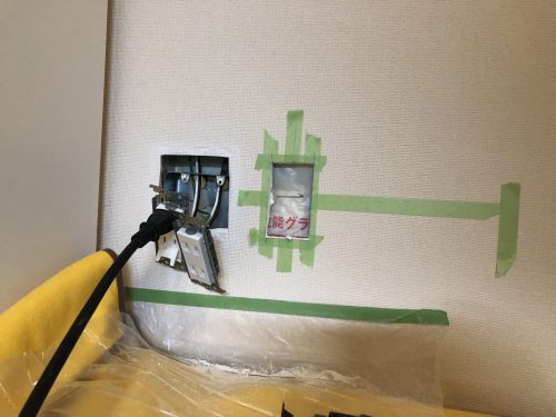 写真はキッチンの調理家電スペースのコンセント追加です。壁の中に構造物がないかいろんな方法を使って調べてから開口を行います。