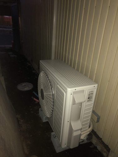 換気扇のフードを付けたりその他いろいろな作業を二人同時進行していましたが、室外機を取り付けるころには真っ暗になってしまいました。