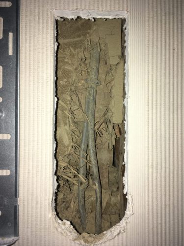 う~ん何とも言えない嫌な感じ。エアコンの配管穴をあけるときはコンセントやスイッチの位置を十分確認して、電気配線が壁の中を通っていない事を確認してから開けるのですが、まさかここに配線が壁に埋まった状態で通っているとは思いませんでした。