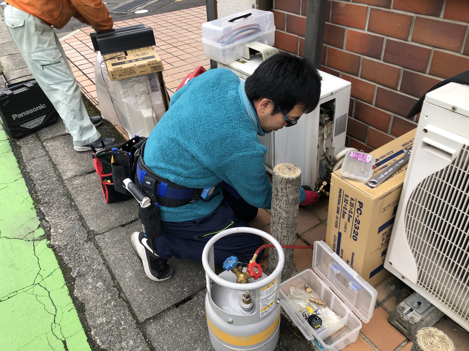 今日もエアコン取付修行中のN君と一緒です。まずは古い室外機の取り外しですが、圧縮機が回転しないのでフロンガスが回収できません。いつものように真空にしたボンベに配管内と室内機に残ったフロンガスを回収します。お店に戻ってから回収したフロンガスをフロンガス回収機を使って室外機に戻しています。