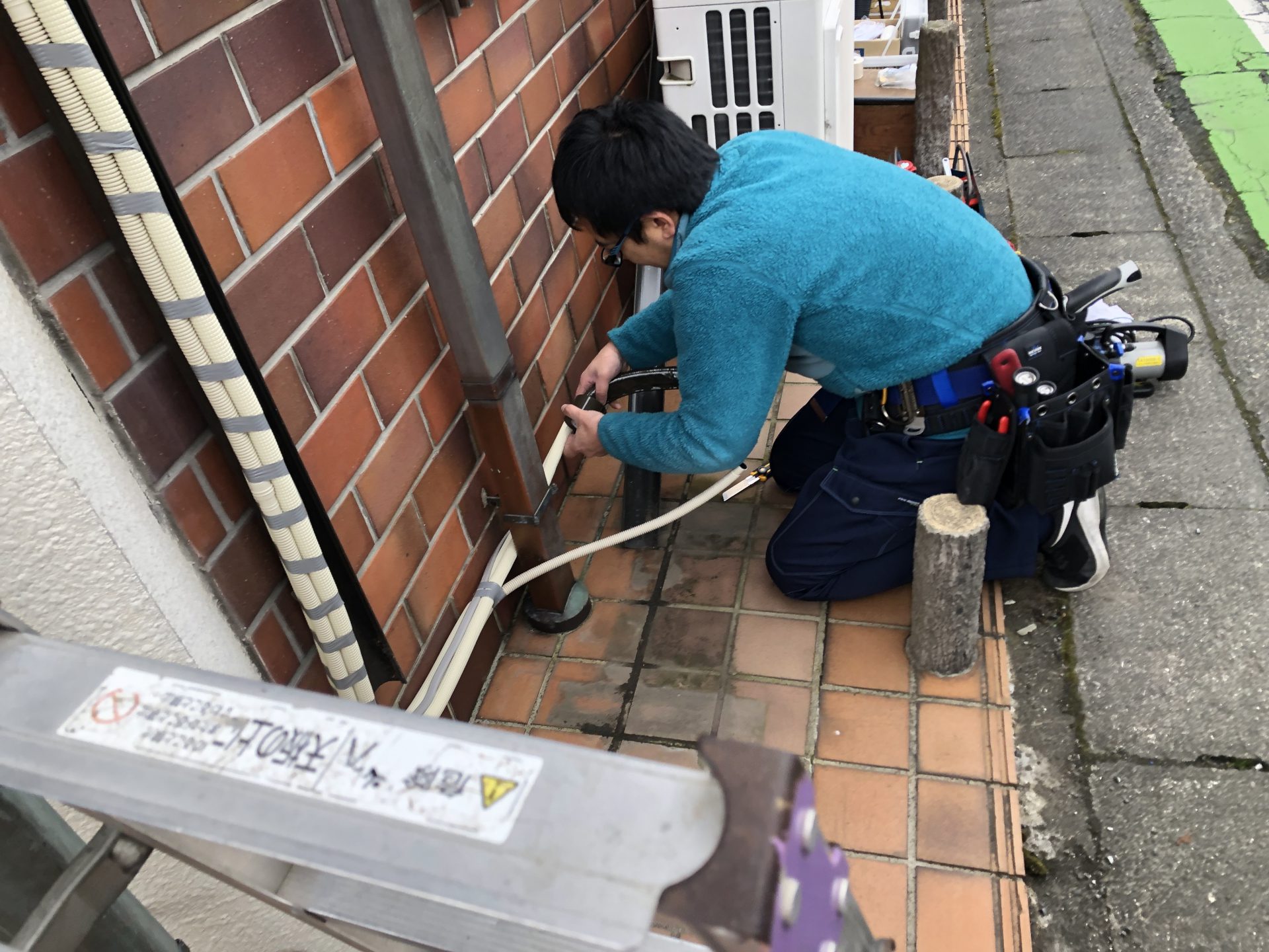 今日は風が強くて寒い日でした。おまけに作業している隣にパッケージエアコンの室外機があり、その冷たい風が作業中のN君に襲い掛かっています。寒い時期には化粧テープも固くなりなかなか上手く巻けません。しかしN君もかなり手馴れてきて綺麗に巻けるようになってきました。