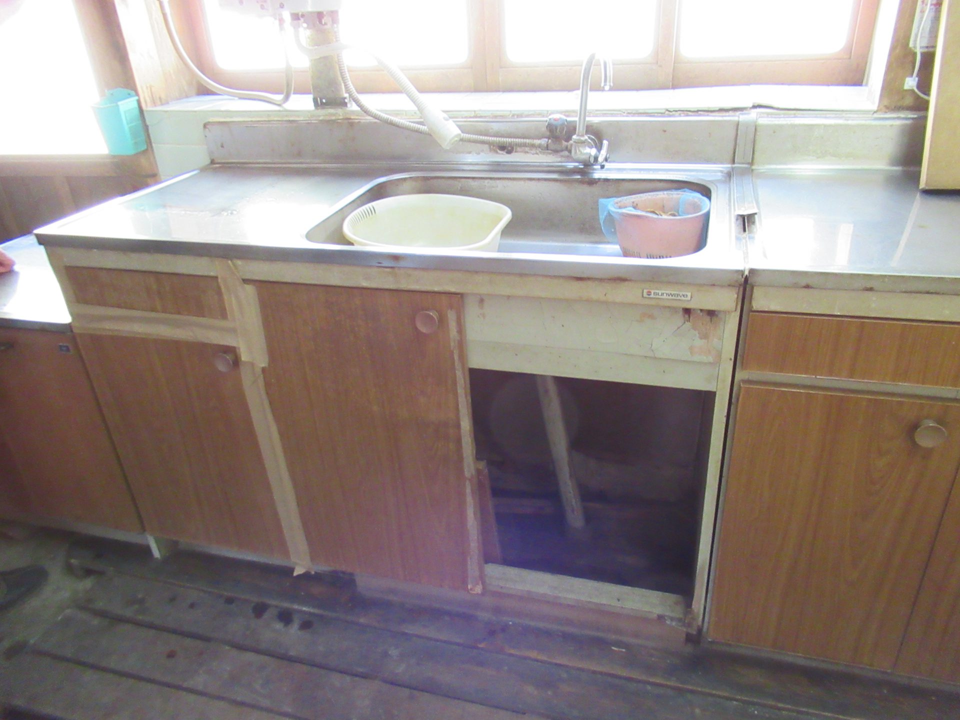 排水があふれるので既設の流し台は足元が腐ってしまってボロボロに。新しい流し台に変えていただくことは決まりました。が、その前に排水詰まりの原因を突き止めなければいけません。いつも湿気ている場所があるという事でその部分を重点的に調べてみると・・・