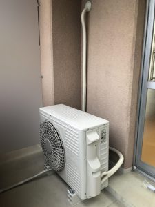 マンションの場合すでにエアコン用の配管穴が開いていることがほとんどですが、エアコンよりも下に空いているので冷媒配管を出来るだけ見栄えよく施工させて頂くことを意識しています。本当は室内用配管ダクトカバーを使うところですが予算の関係でテープ巻きの事も多いです。