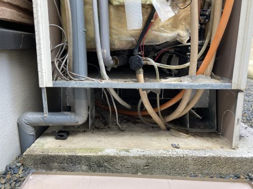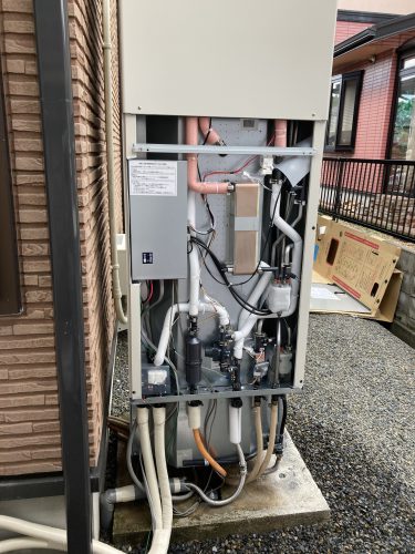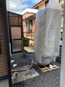 新しいエコキュートを基礎の上にしっかり固定して配管類を繋げていきます。この日は午後から外出したいとのご要望で家の中の作業は午前中で全て完結できるよう2人で手際よく作業をさせて頂きました。