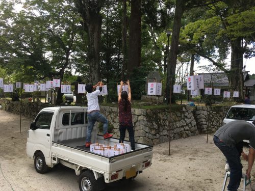 300個近くの提灯を点灯させるための配線を行います。例年配線の老朽化で補修が大変でしたが、今年は新調していただき補修にかかる時間もなく大変短時間で作業を進めることができました。配線や提灯の取付は氏子青年会の方々と共に作業をします。