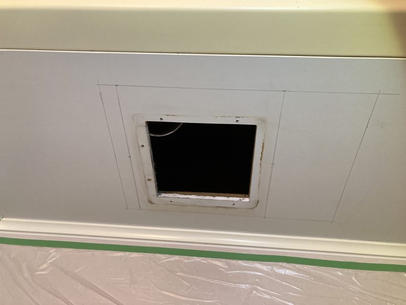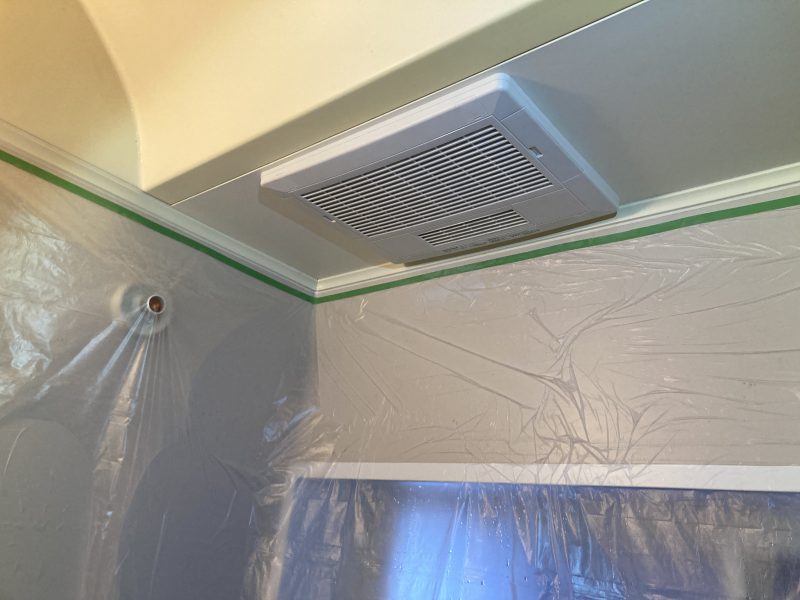 養生をしっかり行って開口を広げ暖房機を取付します。換気扇よりも重いので補強材を入れて施工しますがユニットバスの構造によっては躯体から吊り下げて天井に重量が掛からないように処置を行います。