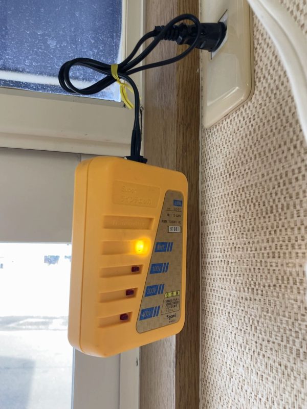 新しく取り付けさせていただくエアコンは2ランク能力を大きくしていただいたので100Vのコンセントを200Vに切り替える必要があります。こういった機械を使って回路の特定をするのですが、その際にこのエアコンの下についている一般のコンセントと配線が供用されている事が分かりました。