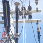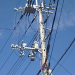 このような機材がついている電柱は防犯灯を取り付けることが出来ません。新たにポールを建ててそちらに防犯灯を設置する事になります。