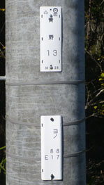 このように2つ付いている電柱もありますが両方とも確認いただき、その際どちらが上についているかも確認をお願いします。この写真は上が関西電力で下がNTTの電柱番号です。上にある方が電柱の所有者です。ですのでこの写真の電柱は関西電力の電柱です。