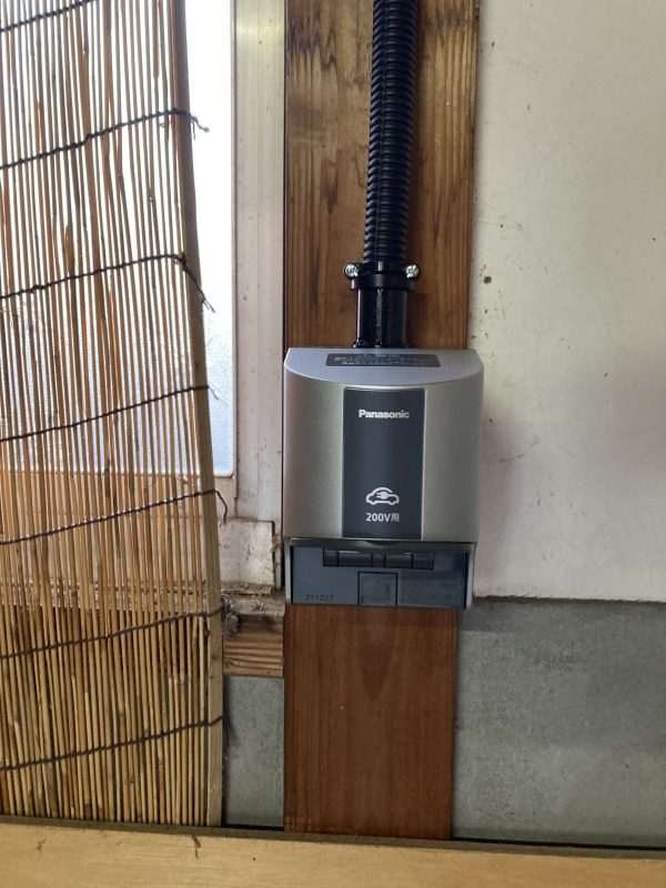 車庫から電源の取出せる場所まで遠い場合にはこのように埋設工事を行うこともあります。コンセントは20Aですが、将来の事も考えて30A対応の配線を保護管に入れて埋設させていただきました。