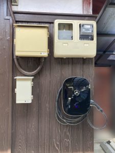 こちらのお客様は出来るだけ目立たないようにというご要望でしたが、幸いにも車庫の近くに電力メーターと主幹ブレーカーがあったので外壁の隙間を上手く使うことが出来て配線が見えない施工をさせて頂くことが出来ました。