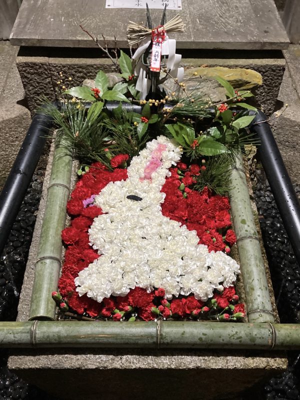 その後櫟野寺、大鳥神社と3か所を回りました。大鳥神社の花手水は干支のかわいいウサギ。多くの方が写真を撮られてました。