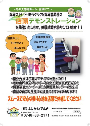 12月9日(土)10(日)に当店で『冬の大感謝セール』をさせていただくのですが、その時にいす式階段昇降機の試乗体験会を予定しています。急な階段や曲がり階段にも設置可能で、スムーズで安心な乗り心地を体験していただきたいと思っています。