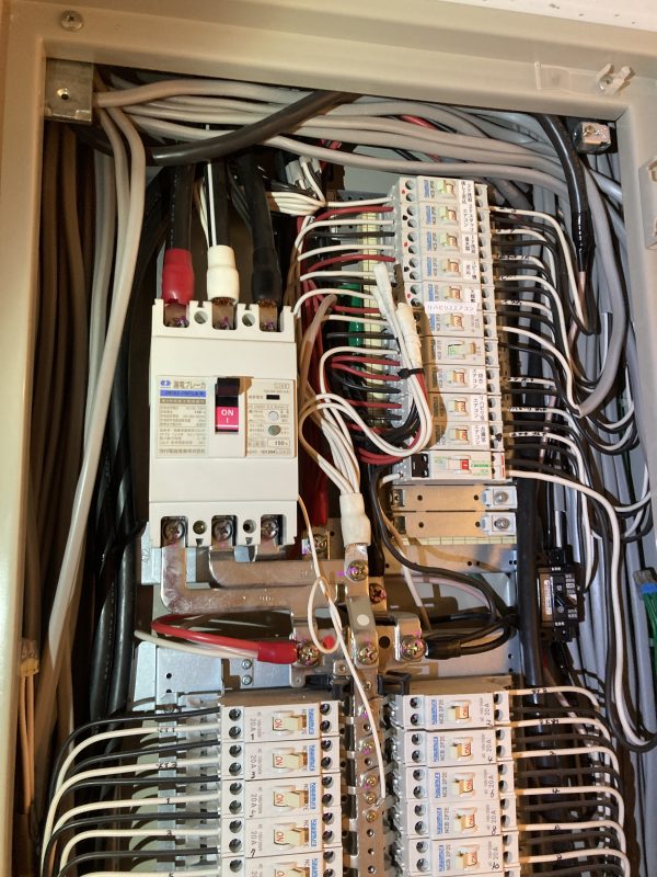 まずは分電盤から充電スタンド用の電源を取り出すのですが、空きスペースに所狭しとブレーカーが押し込まれて何とか30Aのブレーカーを取付けられる場所を確保しました。