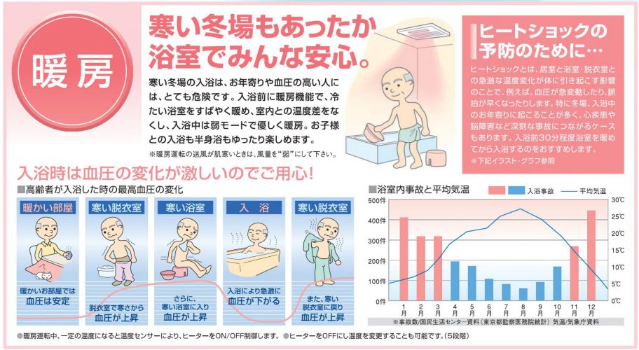 お風呂に入るときに「さぶい!!」って思ったことありませんか?それって血圧が急激に変化して体にもよくありません。浴室暖房機をつけると冬のお風呂が温かくなって本当に快適になるんです。僕が体感してそう思っているのでその良さを是非味わっていただきたいと思っています。