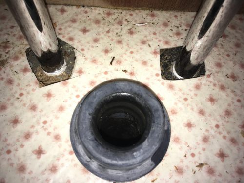 排水ホースが排水溝から完全に抜けてしまっていました。排水トラップをお手入れされたときに抜けたまま気が付かずそのままの状態だったので床に漏れてしまいました。
