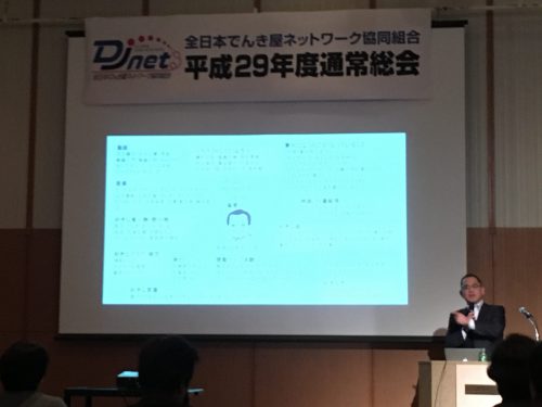 全国から参加のでんき屋さんはみんな元気で前向き!!同業者ならではの情報交換も魅力ですが、今回は総会後の勉強会で異業種の民宿「かどや」さんの今井さんが講師として来てくださいました。