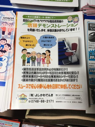 お家の階段の昇り降り辛いときありませんか?既存の階段に取付可能な階段昇降機の点灯デモンストレーションも行います。