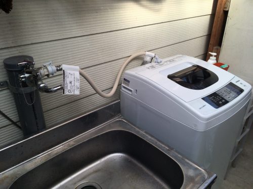 いつもお世話になっている美容院さまから洗濯機を追加設置したいとご依頼いただき下見に行くと電気も水道も排水も近くにありましたが洗い場との共存がご希望でした。
