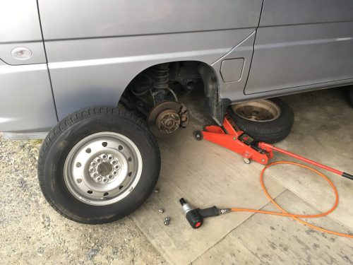10年以上前に買った油圧ジャッキとエアインパクトレンチが大活躍。軽バンなら10分で交換終了。