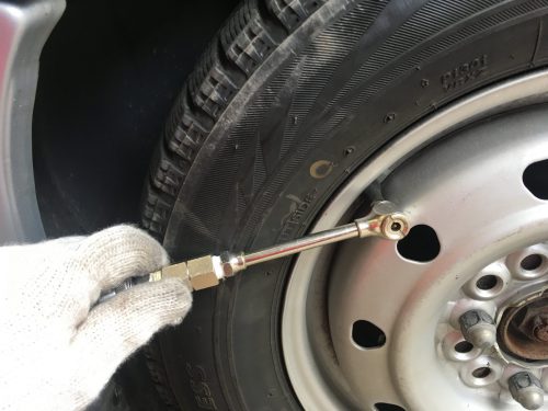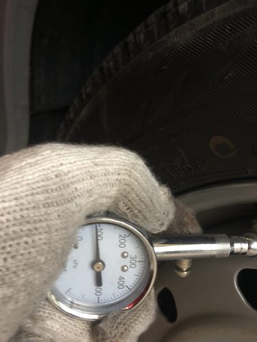 タイヤ交換が終わったら空気圧の確認を。保管していたタイヤは空気が結構抜けてます。