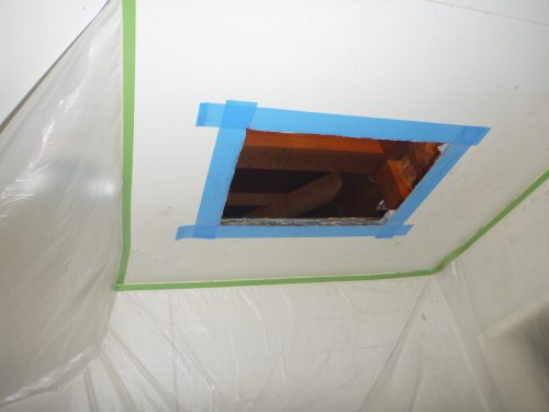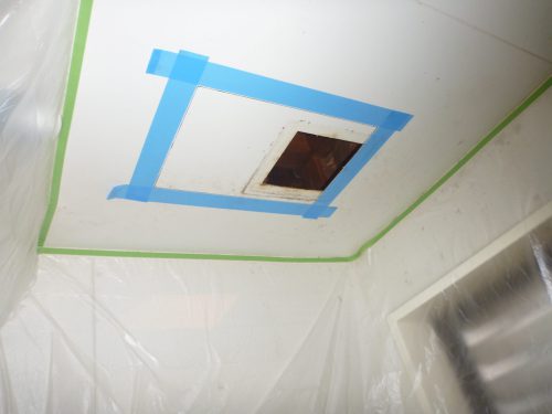 穴を広げる作業。天井板に鉄板が入っているので切り取った後の鉄粉が飛び散らないようにしっかり養生します。鉄粉を放置するともらいさびの原因になってしまうので注意が必要です。