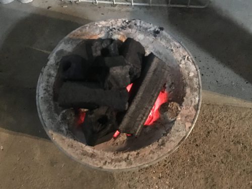 20時過ぎから火おこし開始~おがくず成型備長炭は値段も安く火がついたら長持ちでお気に入りです。