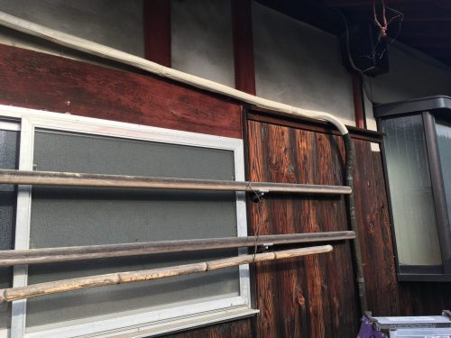 屋外配管は、プロパンガスから離隔距離をとるために横引き配管が長くなってしまいました。家の裏の目立たない場所という事でテープ巻きで仕上げです。