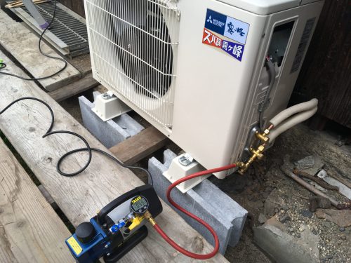 室外機設置場所に段差があるのでブロックで水平が取れるように設置しました。配管が終わると電動真空ポンプで配管内を真空乾燥させます。