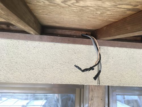 セコムの監視カメラ撤去後。電源(活線)と信号線は丸めてそのまま。
