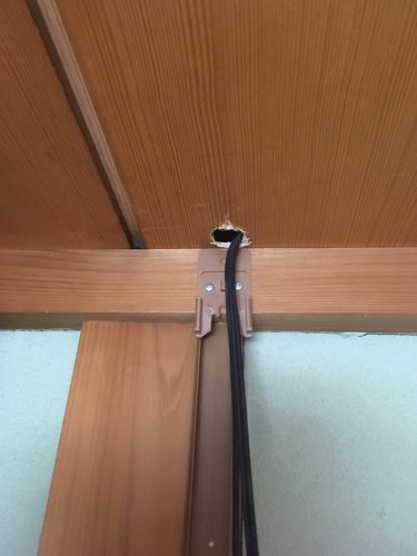 屋内配線も進めていきます。セコム監視カメラの穴を利用して配線を通しますが穴は丸見えの状態で施工してありました。