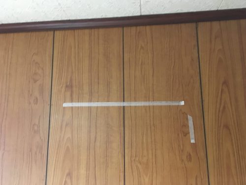 まずは、室内機取付の位置を決めます。65φの穴を開けるのに室外側に干渉物がないか、柱や筋交いなどを避けられる位置を割り出します。