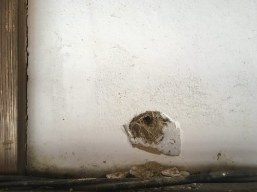 室内側から小さな穴を開けて最終的な穴の位置も確認します。特にこのような漆喰壁はいきなり大きな穴を開けるとボッコリ剥がれてしまうので慎重に作業します。