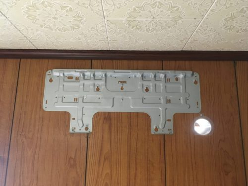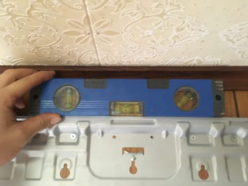 エアコンを取り付けるための背板を固定します。このように水平をしっかり取らないと水漏れの原因になります。