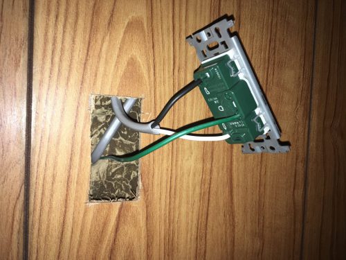 背板の固定が完了すると室内機を取付します。同時進行でエアコン専用コンセントの施工を行います。