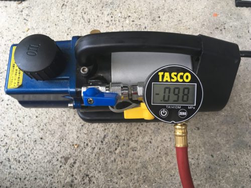 配管が完了すると電動真空ポンプを使って配管内の真空乾燥を行います。